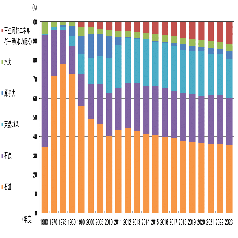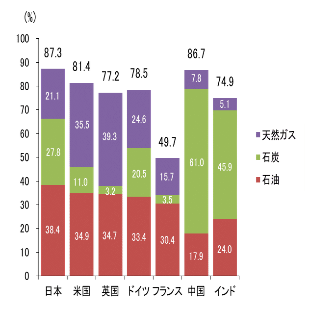 (注)化石エネルギー依存度(%)=(一次エネルギー供給のうち原油・石油製品、石炭、天然ガスの供給)/(一次エネルギー供給)×100。