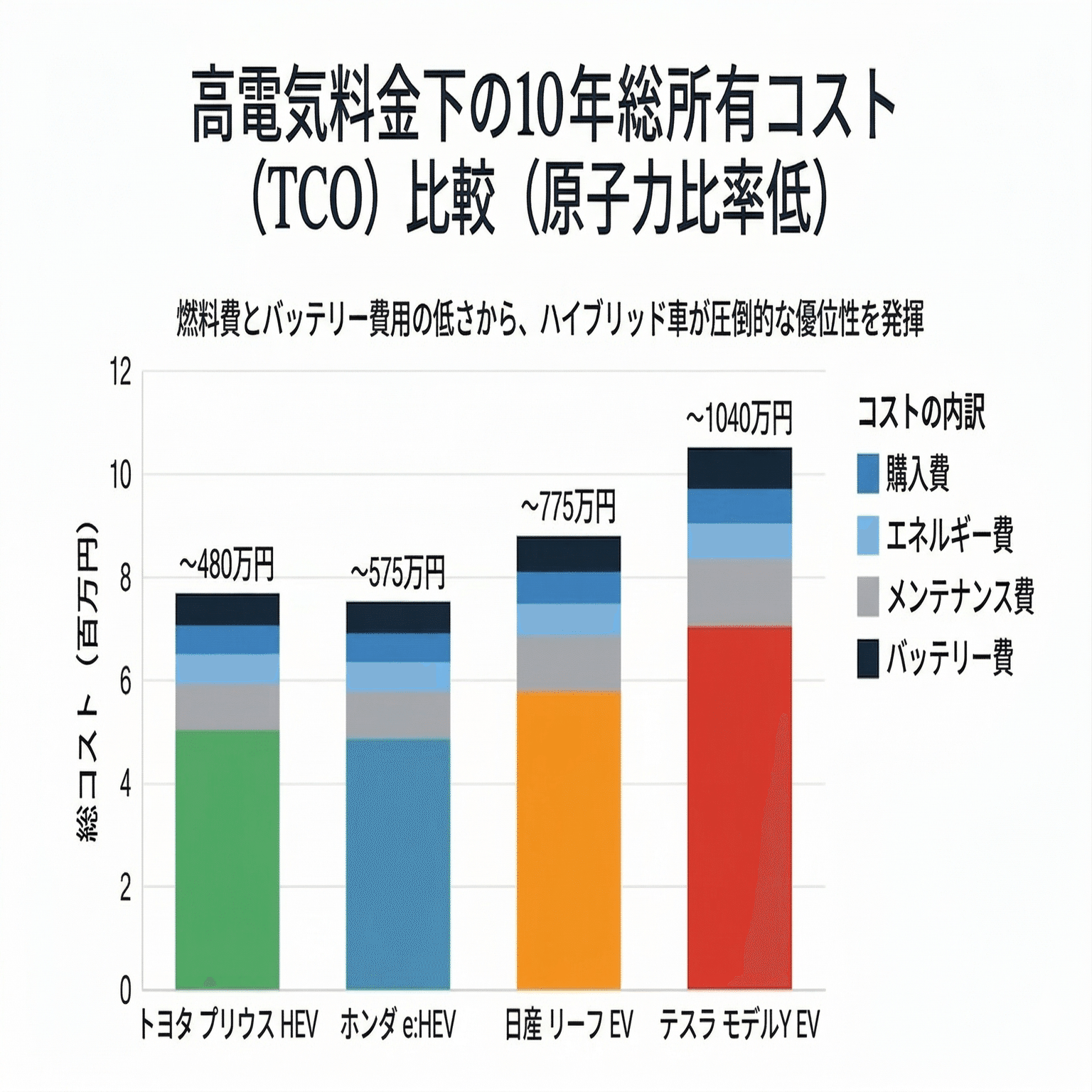 より重要なのは総所有コスト(TCO:Total Cost of Ownership)です。燃料・電気代、維持費、バッテリー交換コストを10年間で試算すると、日本の場合、ハイブリッドが優位になるケースが目立ちます。理由は電力料金の高さ(産業用約30円/kWh、家庭用約40円/kWh前後)と、EVバッテリーの劣化・交換費用(1回200〜400万円)です。